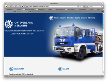 Der Ortsverband Iserlohn wollte eine etwas andere Webseite. Sowohl vom Stil als auch vom Inhalt her hebt sich diese Seite vom CD des THW deutlich ab. Sie zeigt, wie ansprechend man blaue Feuerwehrautos im Internet präsentieren kann.